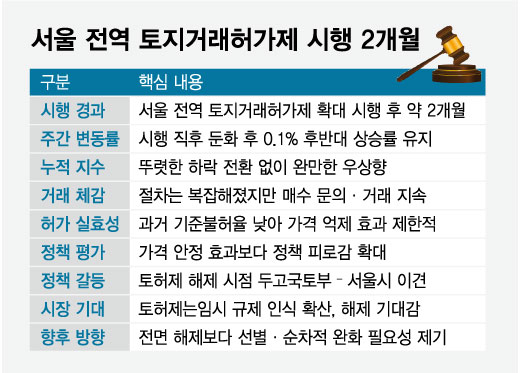 서울 전역에 토지거래허가제가 확대 시행된 지 약 두 달이 지났지만, 시장에서는 가격 안정 효과보다 정책 피로감만 누적되고 있다는 평가가 나온다. 거래 절차는 한층 까다로워졌지만 집값 상승 흐름은 꺾이지 않았다. 중앙정부와 서울시 간 규제 해제 시점을 둘러싼 갈등도 다시 수면 위로 떠올랐다.