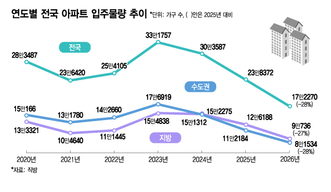 2026년 전국 아파트 입주물량이 올해 대비 28% 급감한다.