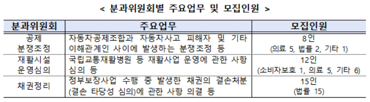 그간 관계기관 추천을 통해 위원을 위촉해 왔으나 보다 합리적이고 공정한 위원 선임을 위해 이번부터 공개모집 방식을 추진한다. 각 분과위원회별로 공제분쟁조정분과 8명(의료5·법률2·기타1), 재활운영심의분과 12명(소비자보호1·의료5·기타6), 채권정리분과 15명(법률15 ) 등 총 35명을 선발한다.