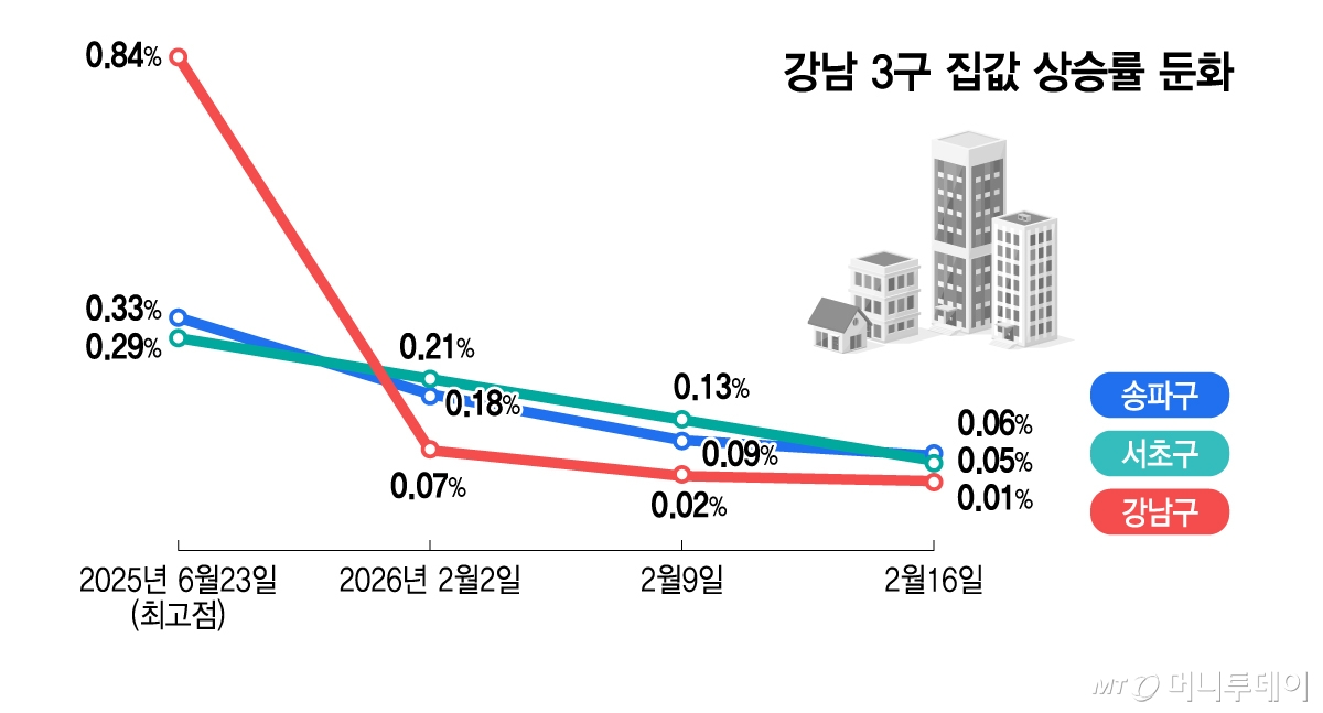 24일 업계에 따르면 서울 강남구 아파트값 상승률이 보합권에 근접했다. 한국부동산원에 따르면 2월 셋째주(16일 기준) 강남구 아파트 매매가격은 전주 대비 0.01% 상승했다. 주간 상승률이 0.5~0.8% 수준이던 현 정부 출범 직후 상황과 비교하면 상승폭이 크게 축소된 모습이다. 서울 전체 25개 자치구 중에서 가장 낮은 상승률이기도 하다. 강남구와 함께 이른바 강남3구로 불리는 서초구(0.05%)와 송파구(0.06%) 역시 상승폭을 대부분 반납하며 서울 전체 평균 상승률을 크게 하회했다. 최근 잇따른 정책 신호가 복합적으로 작용한 결과라는 분석이다.