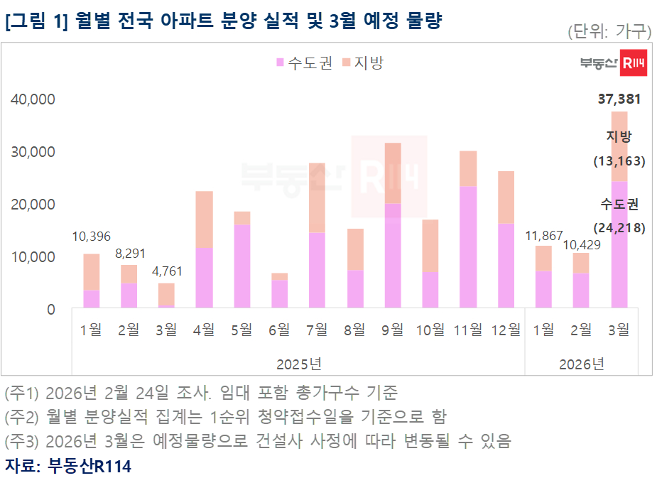 부동산R114 관계자는 "3월 중 LH(한국토지주택공사)의 올해 주택 공급 계획이 공시될 예정이어서 공공분양 아파트를 노리는 수요자들의 청약시장 관심 또한 높을 전망"이라며 "6월3일 지방선거를 앞두고 3∼4월에 공급 일정을 서둘러 소화하려는 건설사들의 움직임도 한층 분주해질 것"이라고 전했다.