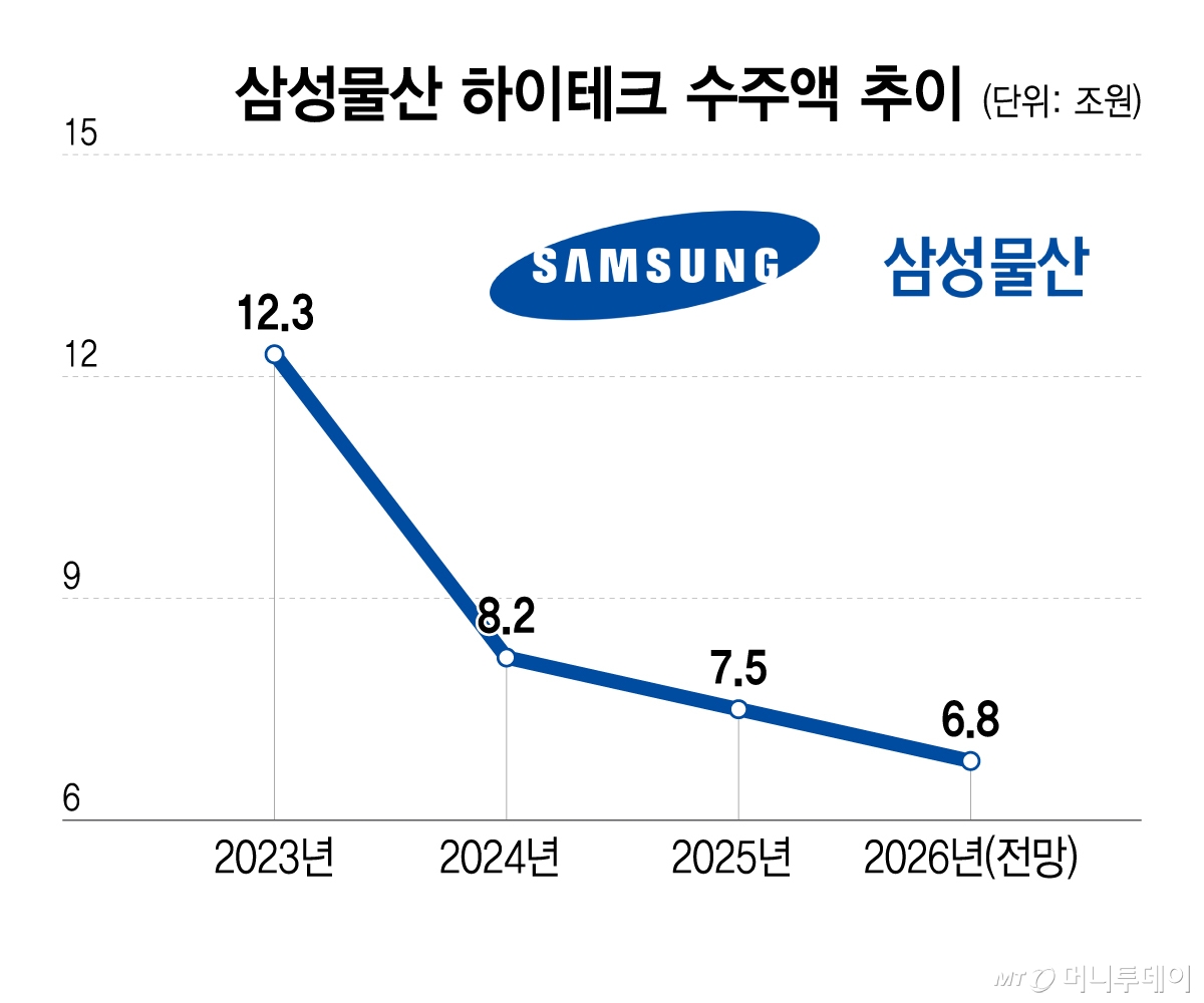 5일 삼성물산에 따르면 건설부문 하이테크 수주는 2023년 12조3000억원에서 2024년 8조2000억원, 2025년 7조5000억원으로 감소했다. 여기에 더해 2026년 수주 목표는 6조8000억원으로 전년 대비 7000억원(9.3%) 줄었다. 2023년 정점과 비교하면 5조5000억원(44.7%) 감소한 수준이다. AI 서버용 고대역폭메모리(HBM) 수요 증가와 글로벌 빅테크의 데이터센터 증설 등으로 반도체 인프라 발주 확대가 예상되는 상황에서 다소 보수적인 목표라는 평가가 나오는 배경이다.