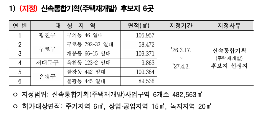 서울 광진구 구의동, 구로구 구로동·개봉동, 서대문구 옥천동, 은평구 불광동 등 신속통합기획 재개발 후보지 6곳이 토지거래허가구역으로 지정됐다. 해당 지역에서는 앞으로 일정 규모 이상의 토지를 거래할 때 관할 구청장의 허가를 받아야 한다.