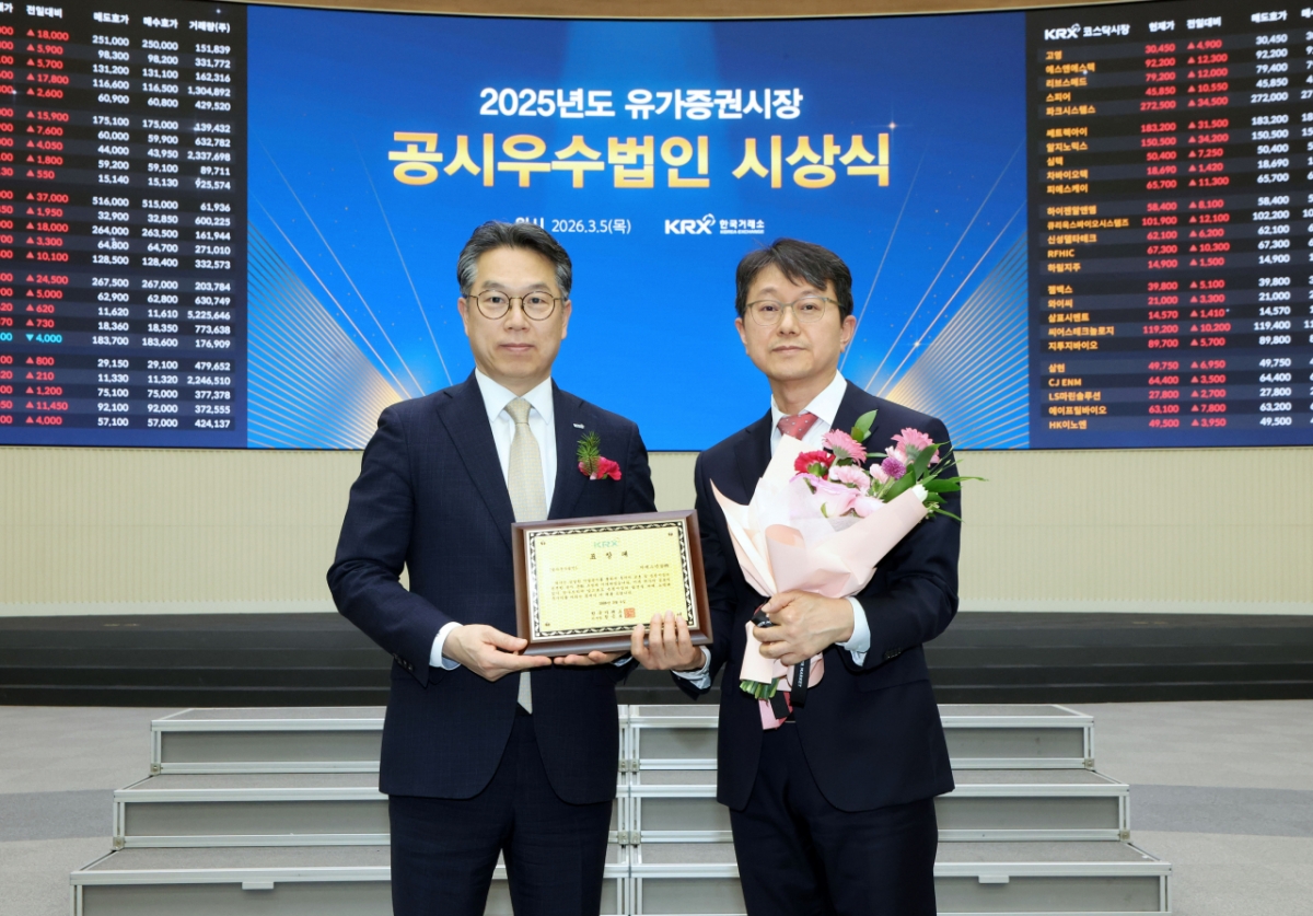 GS건설은 지난 5일 오후 서울 영등포구 여의도동에 위치한 한국거래소 서울 사옥에서 열린 '2025년도 유가증권시장 공시우수법인' 시상식에서 공시우수법인으로 선정됐다고 6일 밝혔다. 시상식에는 GS건설 공시책임자인 강영주 상무가 참석했다.