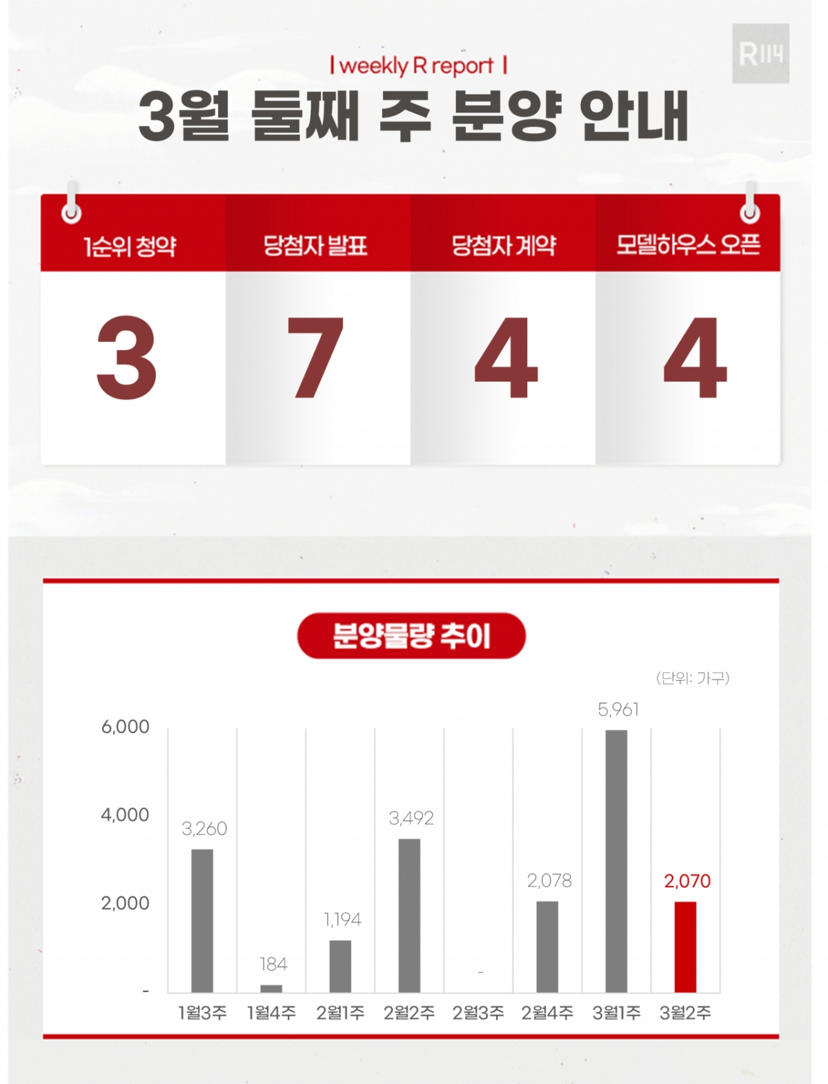 8일 부동산R114에 따르면 3월 둘째 주에는 전국 3개 단지 총 2070가구(일반분양 1279가구)가 공급된다. 경기 수원시 장안구 영화동 '두산위브더센트럴수원', 경북 경산시 상방동 '경산상방공원호반써밋1단지' 등에서 청약을 진행한다.