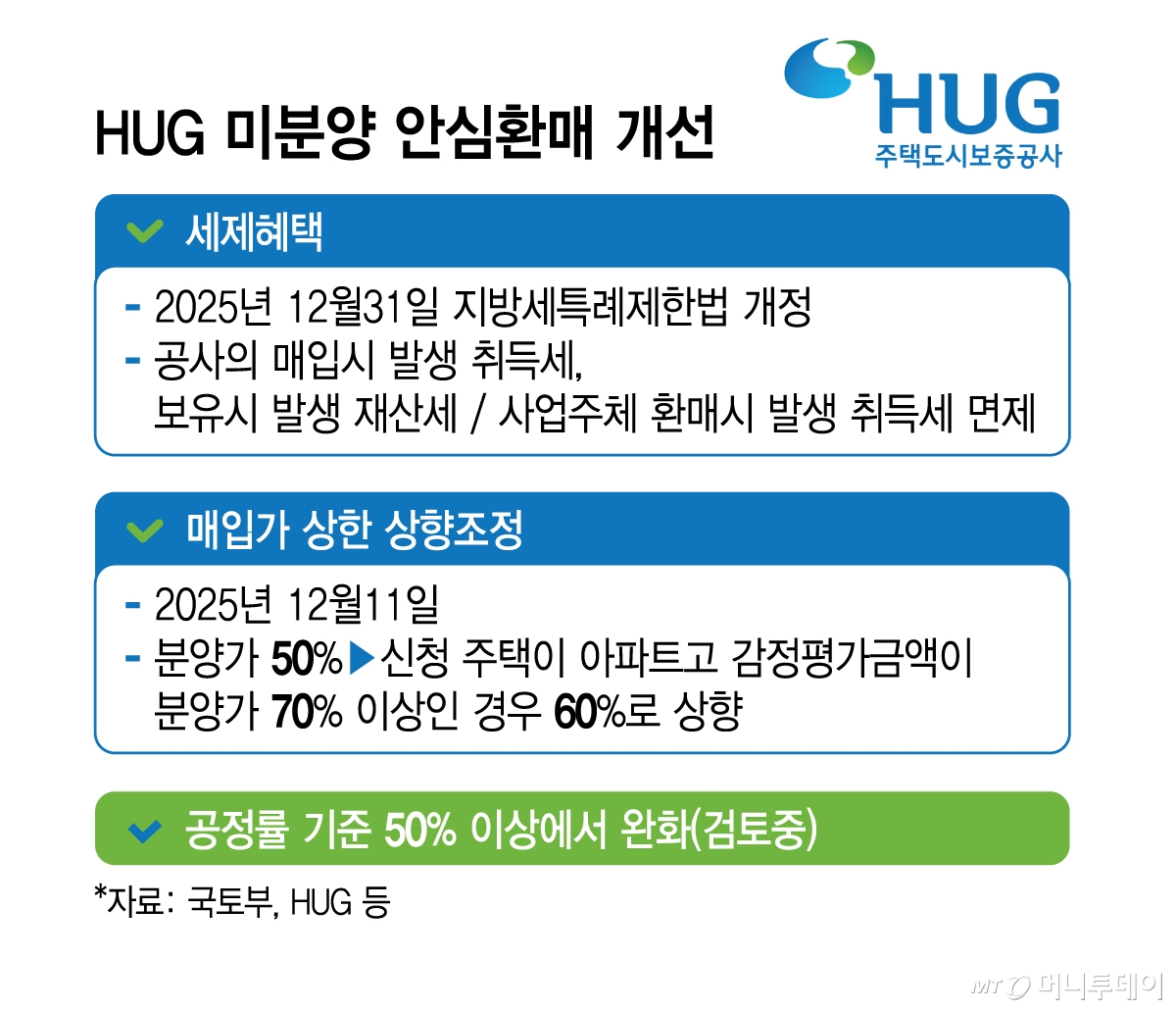 정부가 주택도시보증공사(HUG)의 미분양 주택 안심환매 사업 지원대상의 문턱을 낮춘다.