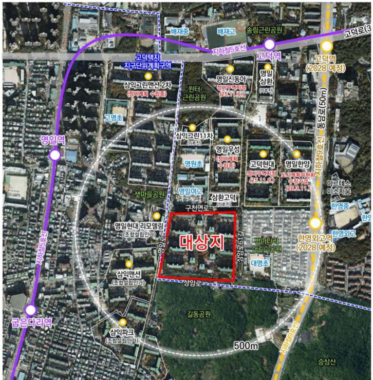 이번 정비계획에서는 단지 중앙을 가로지르는 동서 보행축을 조성해 대명초등학교 통학 동선을 개선하고 2028년 개통 예정인 지하철 9호선 한영외고역과 연계되는 보행 환경을 구축할 계획이다.