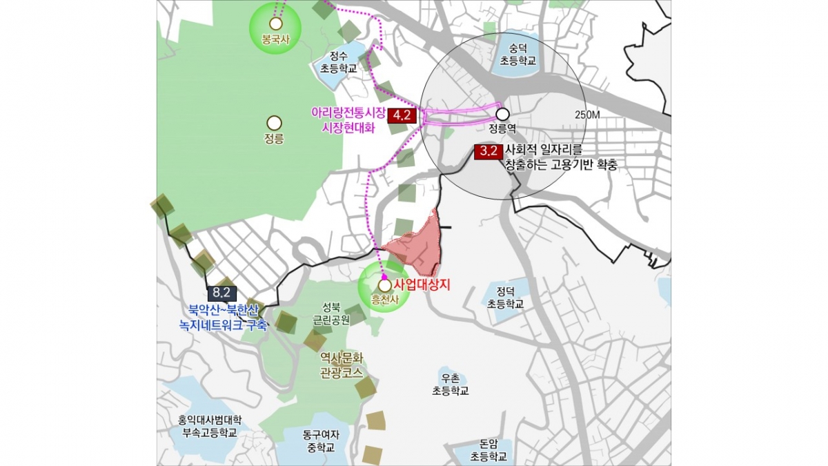 주요 도로 폭도 확장된다. 아리랑로5길은 기존 8~12m에서 12~15m로, 아리랑로5다길은 4~8m에서 8~12m로 넓어진다. 아리랑로5길 변에는 저층부 연도형 개방형 공동이용시설과 근린생활시설을 조성해 '커뮤니티 가로'를 활성화할 예정이다.