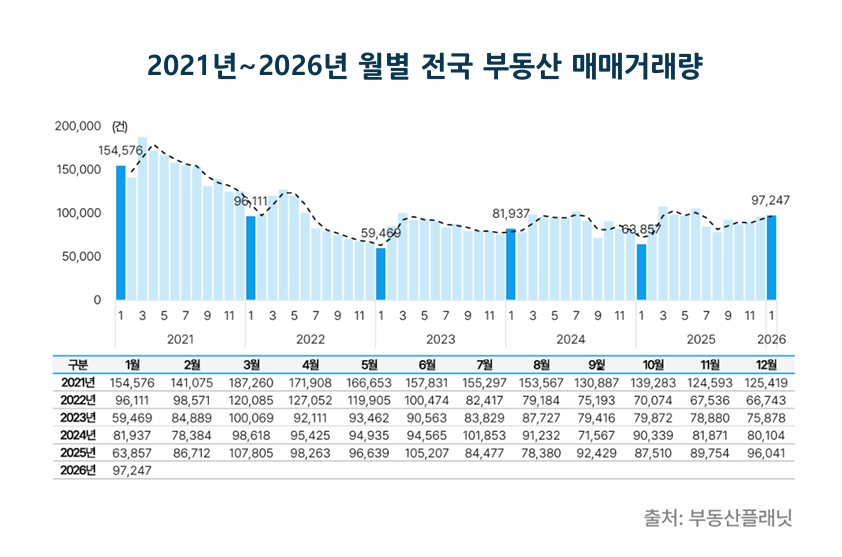 17일 부동산플래닛이 국토교통부 실거래가 자료를 분석한 결과 1월 전국 부동산 매매거래량은 9만7247건으로 전월(9만6041건) 대비 1.3% 증가했다. 반면 거래금액은 36조4601억원으로 1.6% 감소했다. 전년 동월(6만3857건, 20조8088억원)과 비교하면 거래량과 금액 모두 각각 52.3%, 75.2% 늘어난 수준이다.