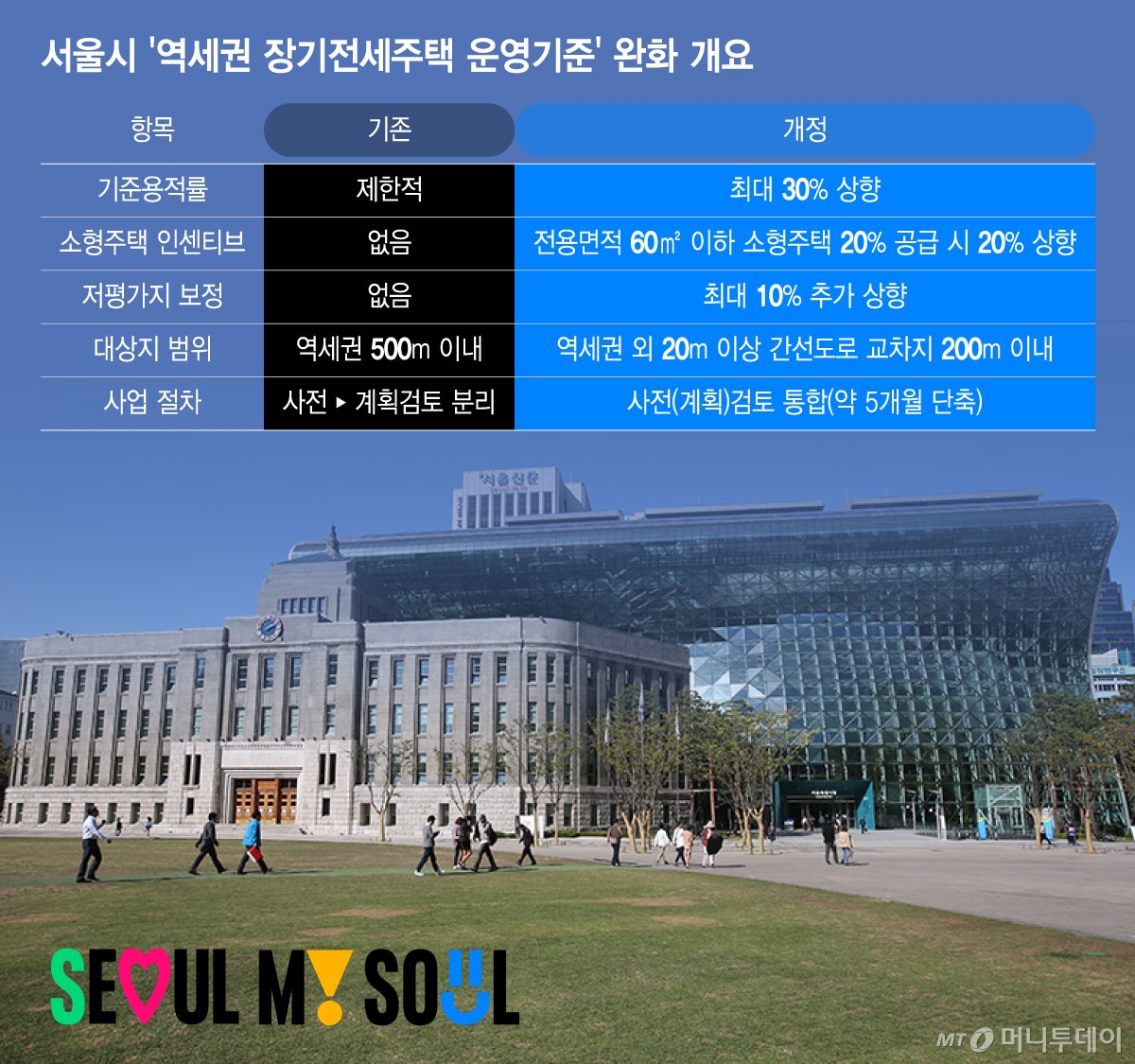 이날 발표의 핵심은 역세권 장기전세주택 사업의 규제완화를 통한 공급확대다. 기준용적률을 최대 30% 상향하고 기존 지하철역 반경 500m로 제한된 사업대상지를 20m 이상 간선도로 교차지까지 확대한다.