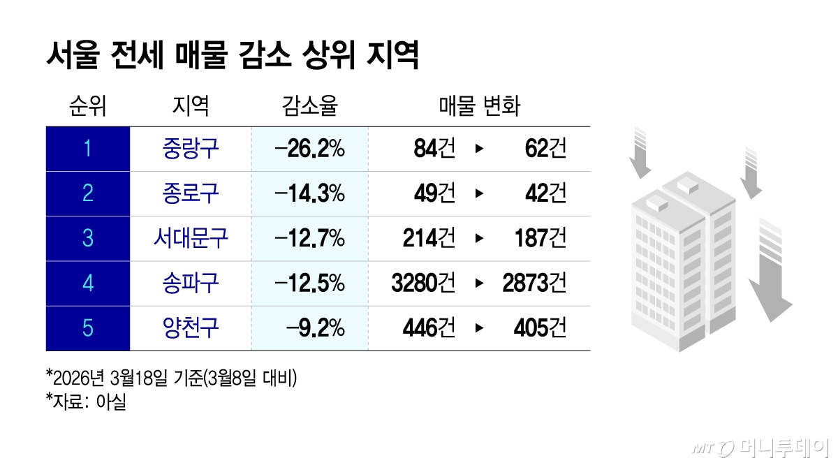 이처럼 현장에서 전세 물건이 줄어드는 흐름은 통계로도 확인된다. 부동산 플랫폼 아실 기준으로 최근 10일 사이 서울 전세 매물은 중랑구(-26.2%), 종로구(-14.3%), 서대문구(-12.7%), 송파구(-12.5%) 등 주요 지역에서 두 자릿수 감소율을 기록했다. 양천구(-9.2%), 구로구(-9.0%), 노원구(-8.0%), 마포구(-7.2%) 등에서도 감소폭이 컸다.