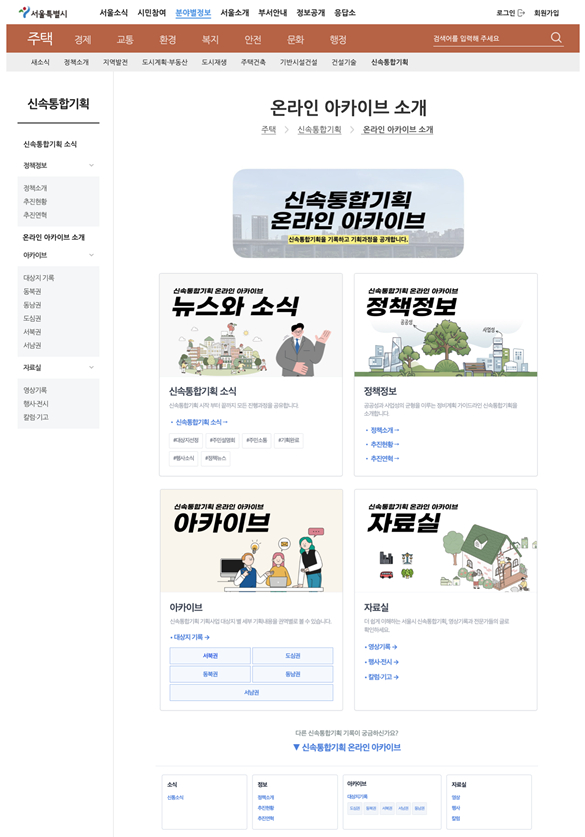 아카이브 공개 이후에도 이용 편의성과 콘텐츠 구성에 대한 개선 사항을 지속적으로 점검·보완하고 대상지별 기획 내용과 제도 변경 사항도 상시 업데이트할 예정이다. 또한 신속통합기획 제도와 온라인 아카이브를 소개하는 숏폼 콘텐츠를 제작·확산하고 오는 6월에는 온라인 이벤트를 연계해 시민 참여를 확대할 계획이다. 신속통합기획 온라인 아카이브는 서울시 누리집(분야별정보 → 주택 → 신속통합기획)에서 확인할 수 있다.