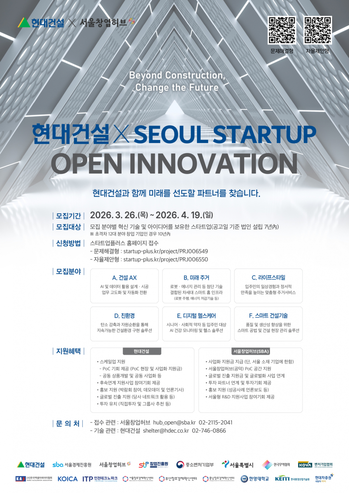 모집 분야는 △건설 AX(인공지능 전환) △미래 주거 △라이프스타일 △친환경 △디지털 헬스케어 △스마트 건설기술 등 총 6개다. 참가 기업은 제시된 과제 해결 가능성을 검증하는 '문제 해결형'과 자유롭게 아이디어를 제안하는 '자율 제안형' 중 하나를 선택할 수 있다.