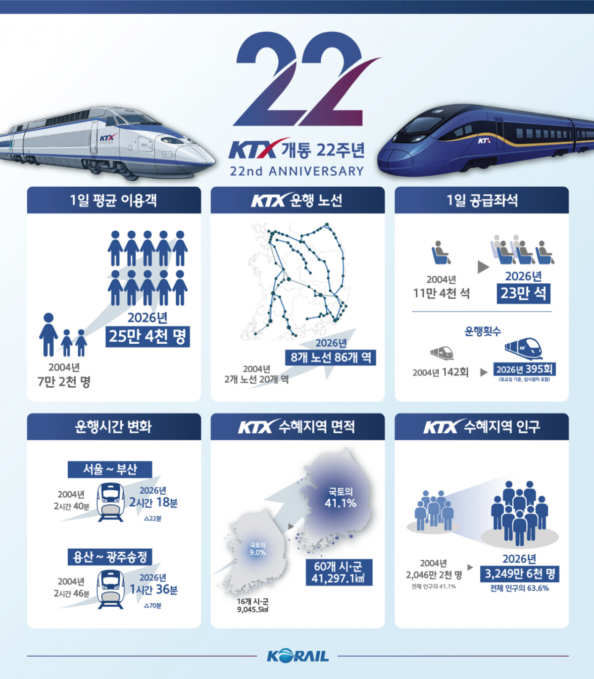 김태승 코레일 사장은 "KTX는 지난 22년간 국민 이동의 중심축으로 자리 잡았다"며 "앞으로도 지역과 지역을 잇는 핵심 교통수단으로 역할을 강화해 나가겠다"고 말했다.