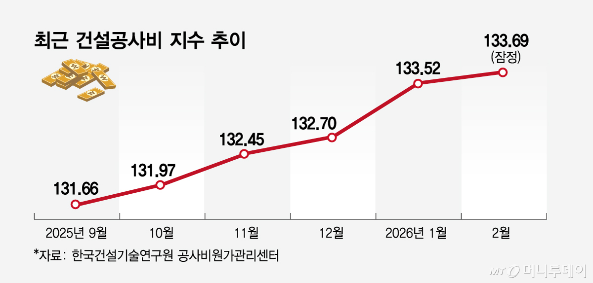 31일 한국건설기술연구원 공사비원가관리센터에 따르면 2월 건설공사비 지수는 133.69(잠정치)를 찍으며 역대 최고치를 갈아치웠다.