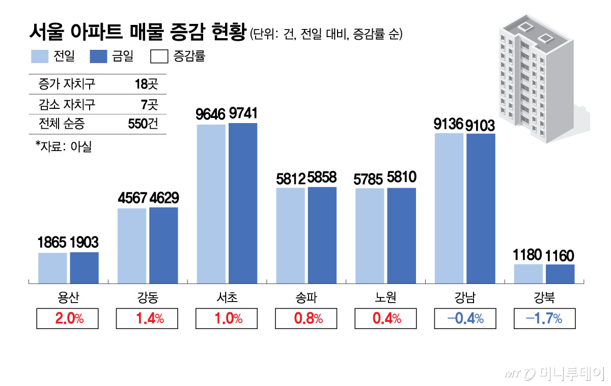 2일 부동산 빅데이터업체 아실에 따르면 전날 대비 서울 아파트 매물은 총 550건 순증했다. 25개 자치구 중 18곳에서 매물이 늘었고 7곳은 감소했다. 서초구가 95건으로 가장 많이 증가했고 강동구(62건), 송파구(46건), 용산구(38건), 노원구(25건) 등이 뒤를 이었다. 서초, 송파, 용산 등 고가 주택 시장에서의 매물 증가 움직임이 두드러졌다. 시장에서는 거래보다 먼저 매물이 움직이는 전형적인 조정 초기 국면이라는 해석이 나온다.
