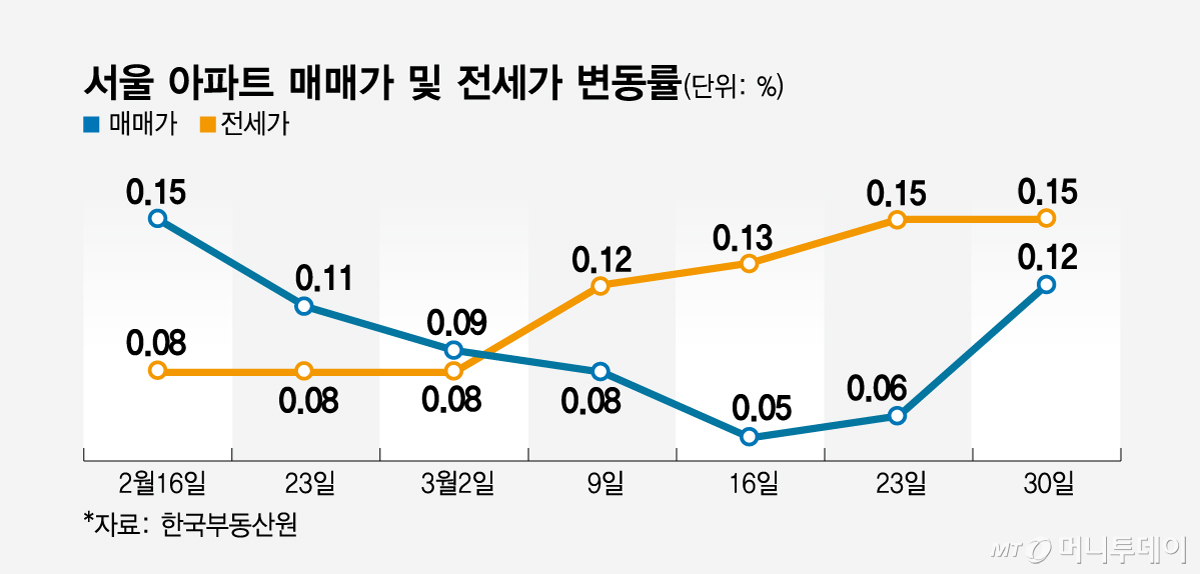 2일 한국부동산원이 발표한 3월 다섯째 주(30일 기준) 전국 주간 아파트가격 동향에 따르면 서울 아파트 매매가격은 전주 대비 0.12% 상승했다. 60주 연속 상승 흐름이 이어진 가운데 전주(0.06%)에 비해 상승폭도 확대됐다. 강남3구와 함께 하락전환 했던 용산구가 5주 만에 상승세를 회복했고 동작구는 하락전환 2주 만에 다시 상승 전환했다.