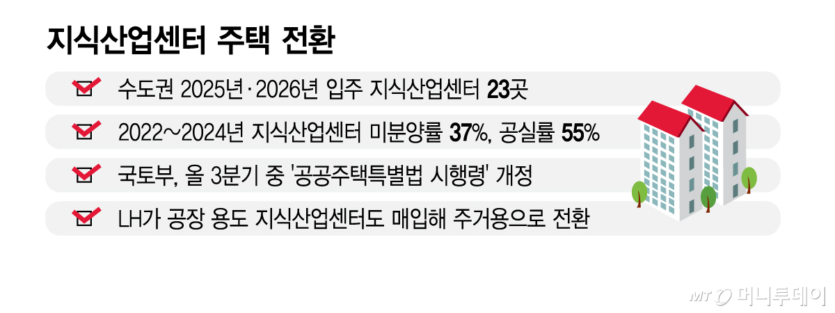 국토교통부는 올 3분기 중 '공공주택특별법 시행령'을 개정, LH가 지식산업센터를 매입한 후 이를 주거용으로 전환할 수 있도록 길을 터줄 계획이다. 기존에는 업무시설 용도 건축물만 매입할 수 있었지만 앞으로는 공장 용도 건축물도 포함된다. 지식산업센터 상당수가 건축법상 '공장'으로 분류된 현실을 반영한 조치다.