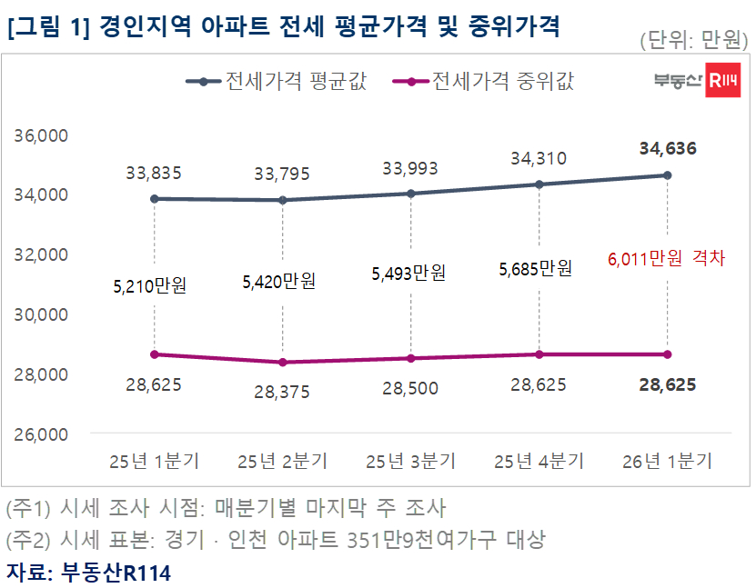 7일 부동산R114에 따르면 올해 1분기 경기·인천 아파트 평균 전셋값은 3억4636만원으로 전 분기 대비 326만원, 전년 동기 대비 801만원 상승했다. 반면 중위 전셋값은 2억8625만원으로 변동이 없었다. 이에 평균 전셋값과 중위값간 격차는 6011만원으로 확대됐다. 중저가 전세시장은 정체된 반면 고가 신축이나 인기지역을 중심으로 강한 전셋값 오름세가 나타나며 전체 평균을 끌어올린 결과로 풀이된다.