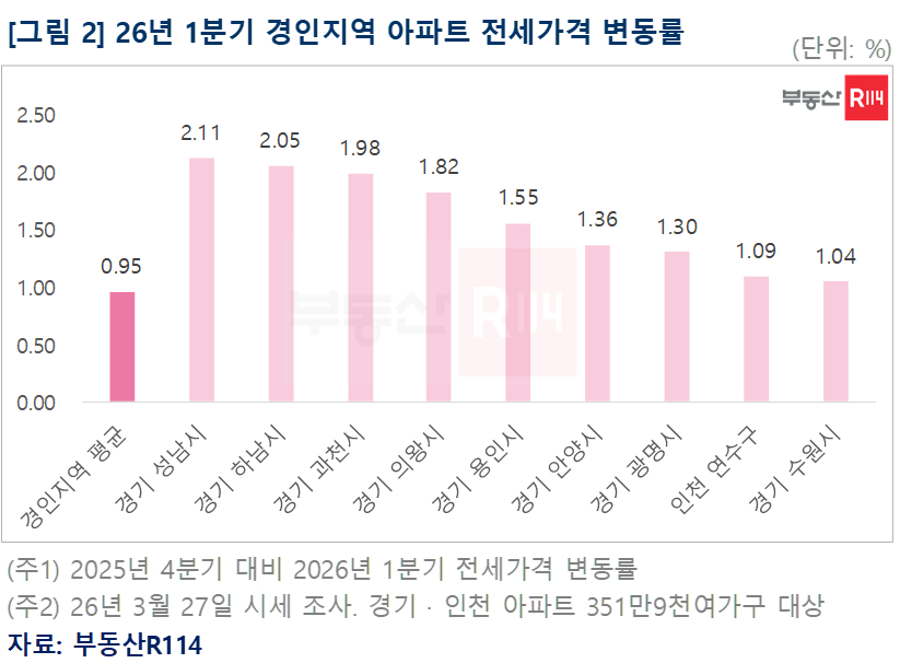 지역별 편차도 뚜렷했다. 임차 수요가 꾸준히 유입되는 경기권 선호지역이 상승 흐름을 주도한 가운데 1분기 경기·인천 전셋값 변동률은 전 분기 대비 0.95% 상승을 기록했다. 성남이 2.11%로 가장 크게 올랐고 하남도 2.05%로 2%대 상승률을 기록했다. 이어 과천 1.98%, 의왕 1.82%, 용인 1.55% 순으로 상승폭이 컸다.