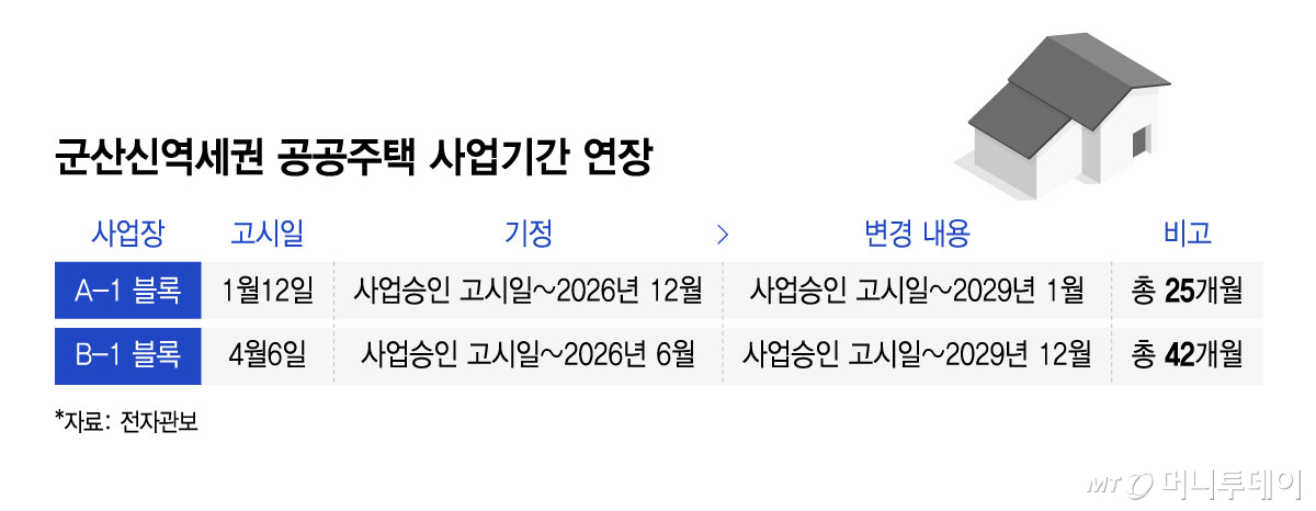 사업기간이 이처럼 대폭 길어진 원인은 분양경기 침체에서 찾을 수 있다. 사업주체인 한국토지주택공사(LH)는 당초 군산신역세권 지구 A-1블록과 B-1블록 사업을 동시에 진행키로 했지만 분양여건이 악화하면서 계획수정이 불가피해졌다.