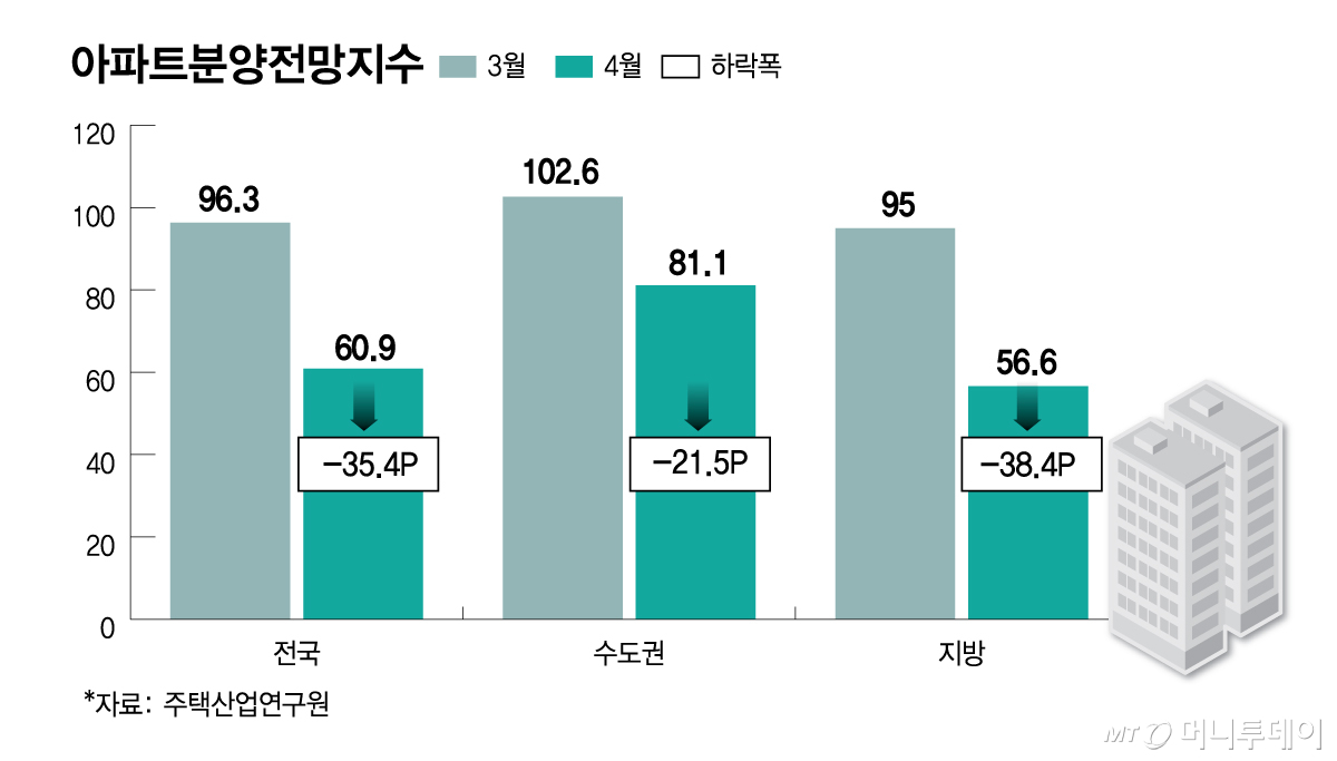 아파트 분양전망지수가 한 달 새 35.4포인트(P) 급락하며 통계작성 이후 최대 낙폭을 기록했다. 고금리 상황과 정부의 규제, 중동전쟁 불안 등 대내외 변수에 따른 시장충격이 빠르게 확산하는 모습이다.