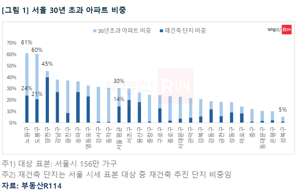 8일 부동산R114에 따르면 서울 아파트 가운데 준공 30년 이상 노후 주택 비중은 약 30%로 집계됐다. 단지 노후화가 진행되면서 주거 환경 개선 수요가 커지고 도심 내 신규 주택 공급 역시 정비사업 중심으로 이뤄질 수밖에 없는 구조다.