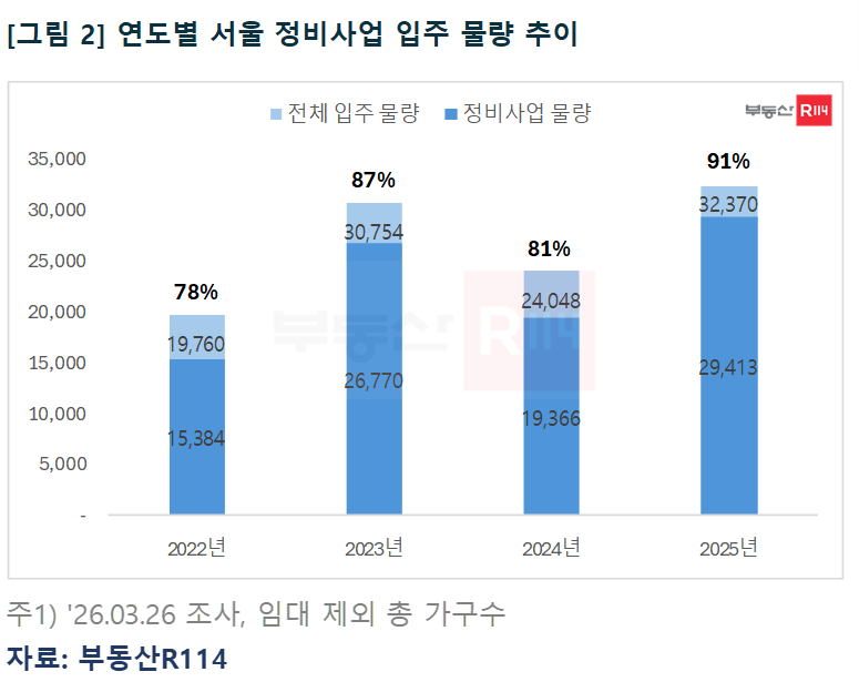서울 주택 공급 구조도 이미 정비사업 중심으로 재편됐다. 2025년 기준 아파트 입주 물량의 91%가 재개발·재건축을 통해 공급됐다. 2022년 78%, 2023년 87%, 2024년 81% 등 최근 몇 년간 신규 공급 대부분이 정비사업에서 나온 것으로 조사됐다.