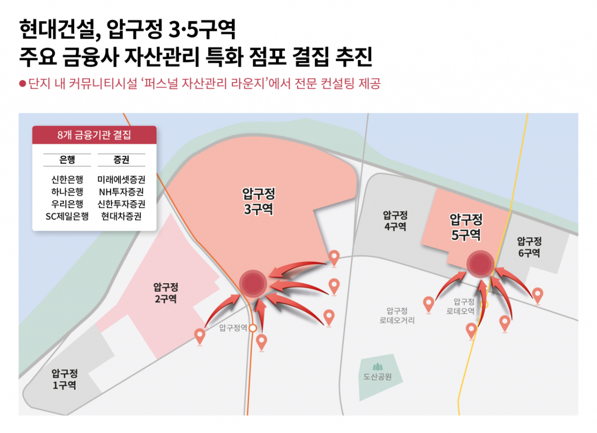 현대건설(183,400원 ▼5,300 -2.81%)이 압구정 3·5구역에 공동주택 최초로 주요 금융사 점포를 결집한 금융권 프라이빗 자산관리센터를 도입한다.