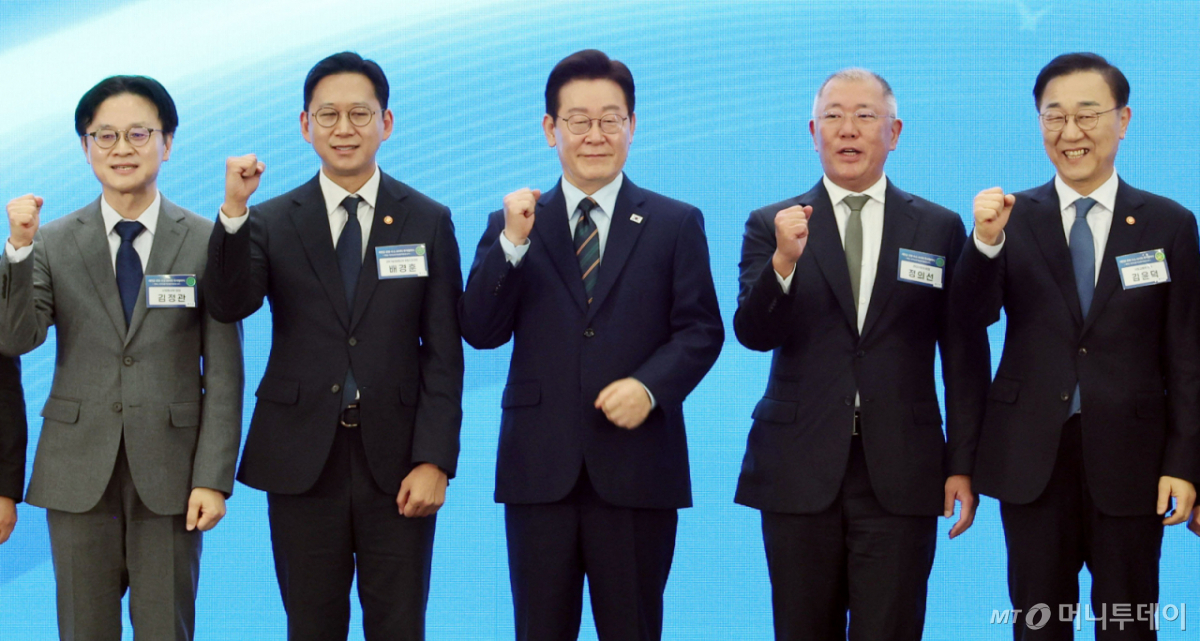 ![[군산=뉴시스] 최동준 기자 = 이재명 대통령이 27일 전북 군산 새만금컨벤션센터에서 열린 '새만금 로봇·수소·AI시티 투자협약식'에서 참석자들과 기념촬영을 하고 있다. 왼쪽부터 김정관 산업통상부 장관, 배경훈 부총리 겸 과학기술정보통신부 장관, 이 대통령, 정의선 현대자동차그룹 회장, 김윤덕 국토교통부 장관. (청와대통신사진기자단) 2026.02.27. photocdj@newsis.com /사진=최동준](https://thumb.mt.co.kr/cdn-cgi/image/f=avif/21/2026/04/2026041314111753530_1.jpg)