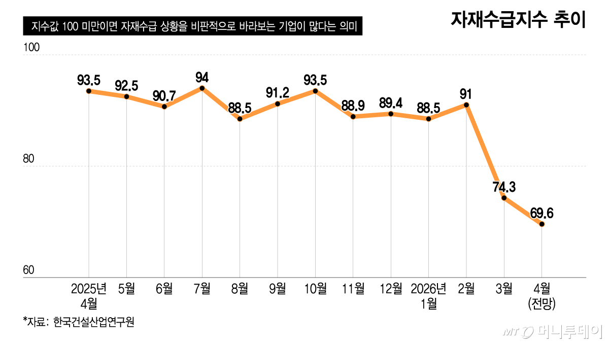 자재수급 동향을 확인할 수 있는 통계 지표도 급속도로 악화하고 있다. 한국건설산업연구원에 따르면 3월 자재수급지수는 74.3으로 전월 대비 16.7포인트 급락했다. 건설경기실사지수 세부 항목 가운데 가장 큰 낙폭이다. 4월 전망은 더 우울하다. 4월 전망치는 69.6으로 70선 하회가 예상된다. 자재수급지수가 70선을 밑도는 것을 2024년 지수 개편 이후 처음이다. 2024년 개편 당시 평균 자재수급지수는 88이었다.