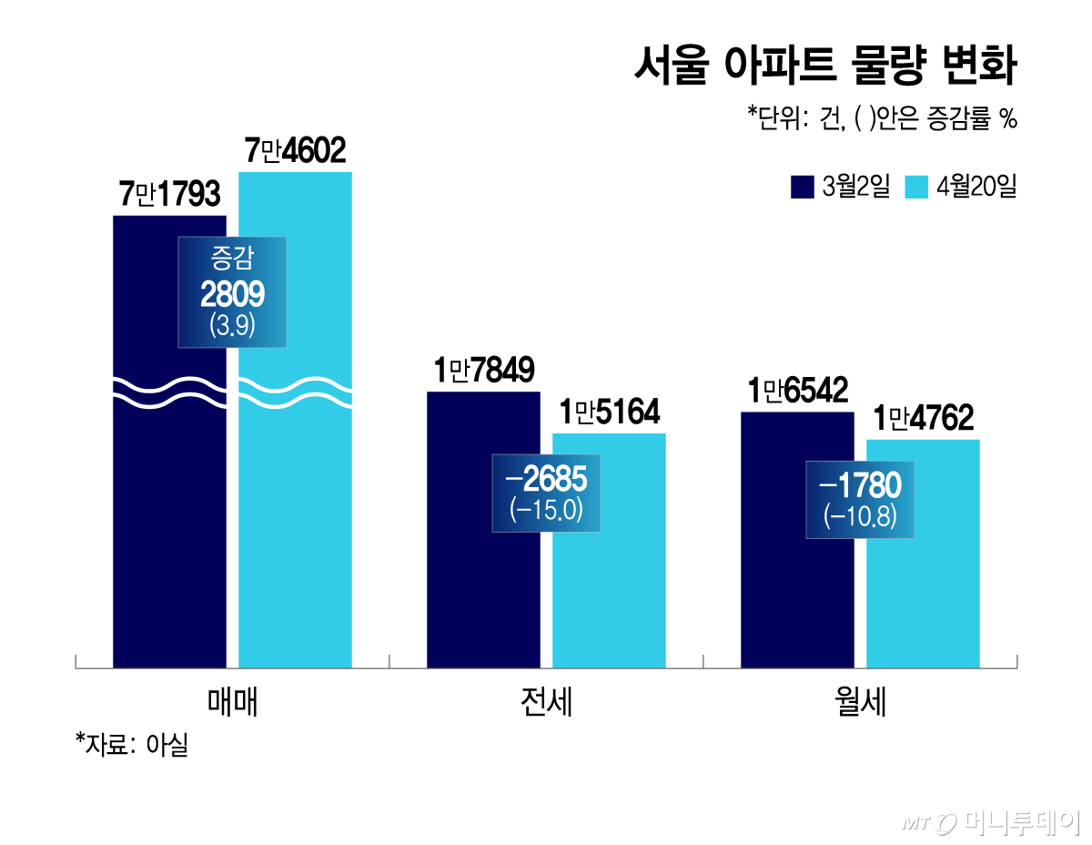 임대차 시장의 변화는 더 뚜렷하다. 3월2일 1만7849건이던 서울 전세 매물은 20일 현재 1만5164건으로 2685건(15.0%) 감소했다. 같은 기간 월세 매물은 1만6542건에서 1만4762건으로 1780건(10.8%) 감소했다. KB부동산 기준 서울 전세가격 상승률은 3월 초 0.14%에서 4월 중순 0.20%로 확대되며 물건은 줄고 가격은 오르는 '이중 압박'이 나타나고 있다.
