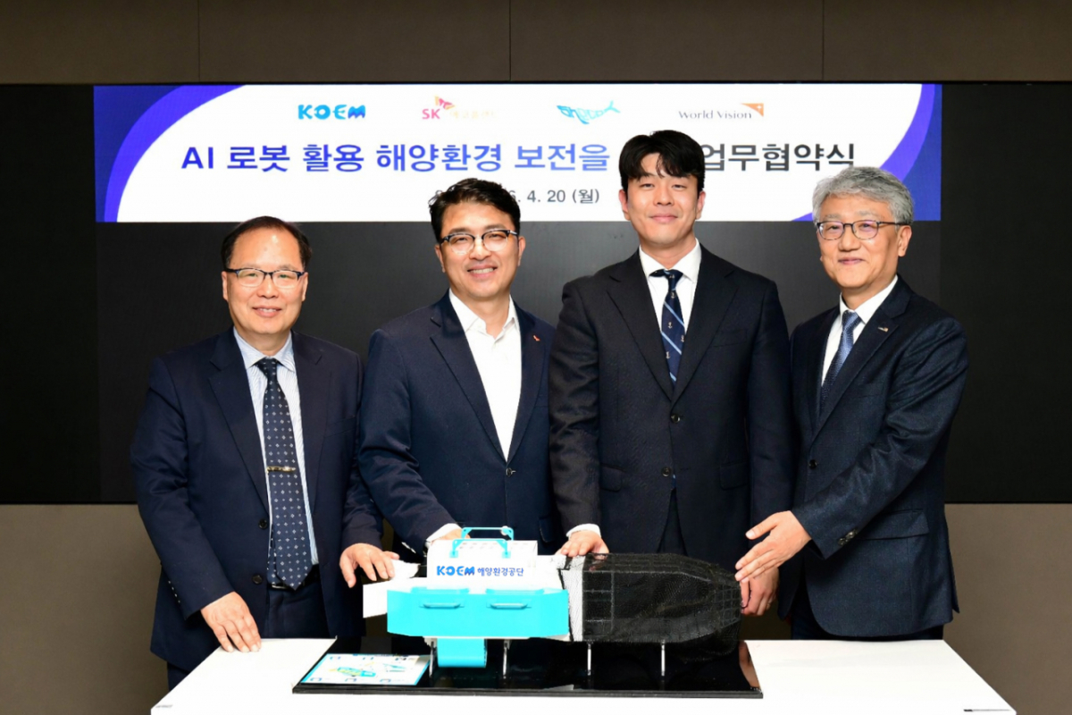 SK에코플랜트는 지난 20일 서울 종로구 수송동 본사에서 해양환경공단, 쉐코, 월드비전과 'AI 해양정화 로봇 도입 및 미래세대 해양환경 교육'을 위한 업무협약(MOU)을 체결했다.