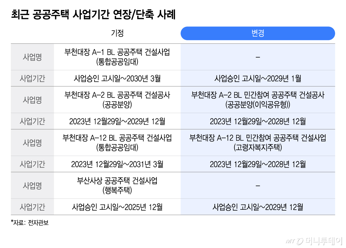 최근 공공주택 사업기간 연장, 단축 사례/그래픽=이지혜