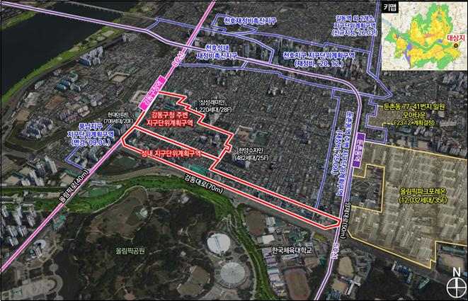 대상지는 성내동 451번지 일대 약 38만㎡ 규모로 잠실과 천호·길동을 잇는 핵심 축에 위치한 지역이다. 행정·주거·여가 기능이 혼재된 입지지만 기존에는 두 개 지구단위계획으로 나뉘어 비효율과 개발 제약이 있었다.