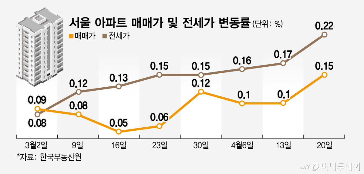 한국부동산원이 23일 발표한 4월 셋째 주(20일 기준) 전국 주간 아파트 가격 동향에 따르면 서울 매매가격지수는 0.15% 상승을 기록했다. 이로써 서울 아파트값은 63주 연속 오름세를 이어갔다. 전주(0.10%) 대비 상승폭도 확대됐다.