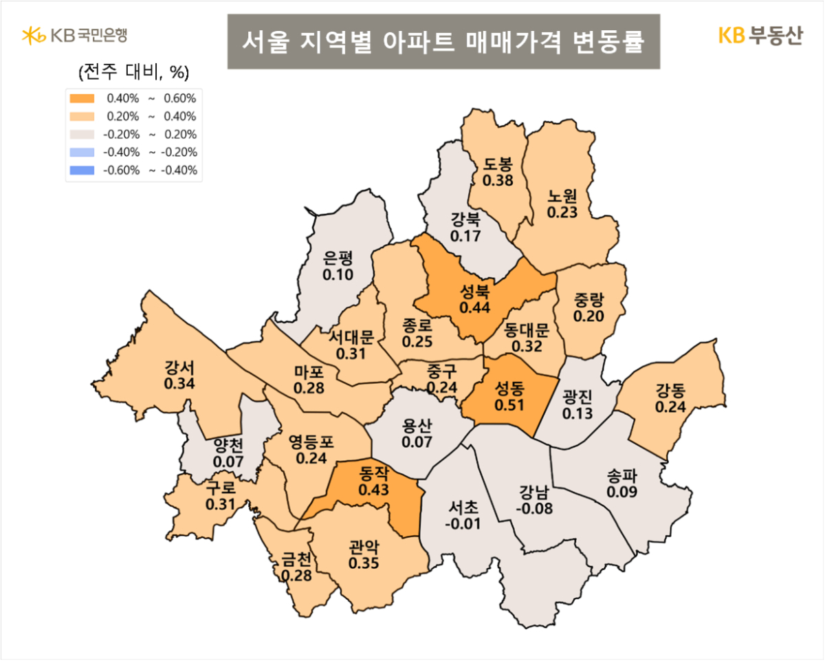 지역별로는 성동구(0.51%), 성북구(0.44%), 동작구(0.43%), 도봉구(0.38%), 관악구(0.35%) 등이 상승을 주도했다. 반면 강남구(-0.08%)는 8주 연속 하락했고 서초구(-0.01%)도 하락 전환했다.