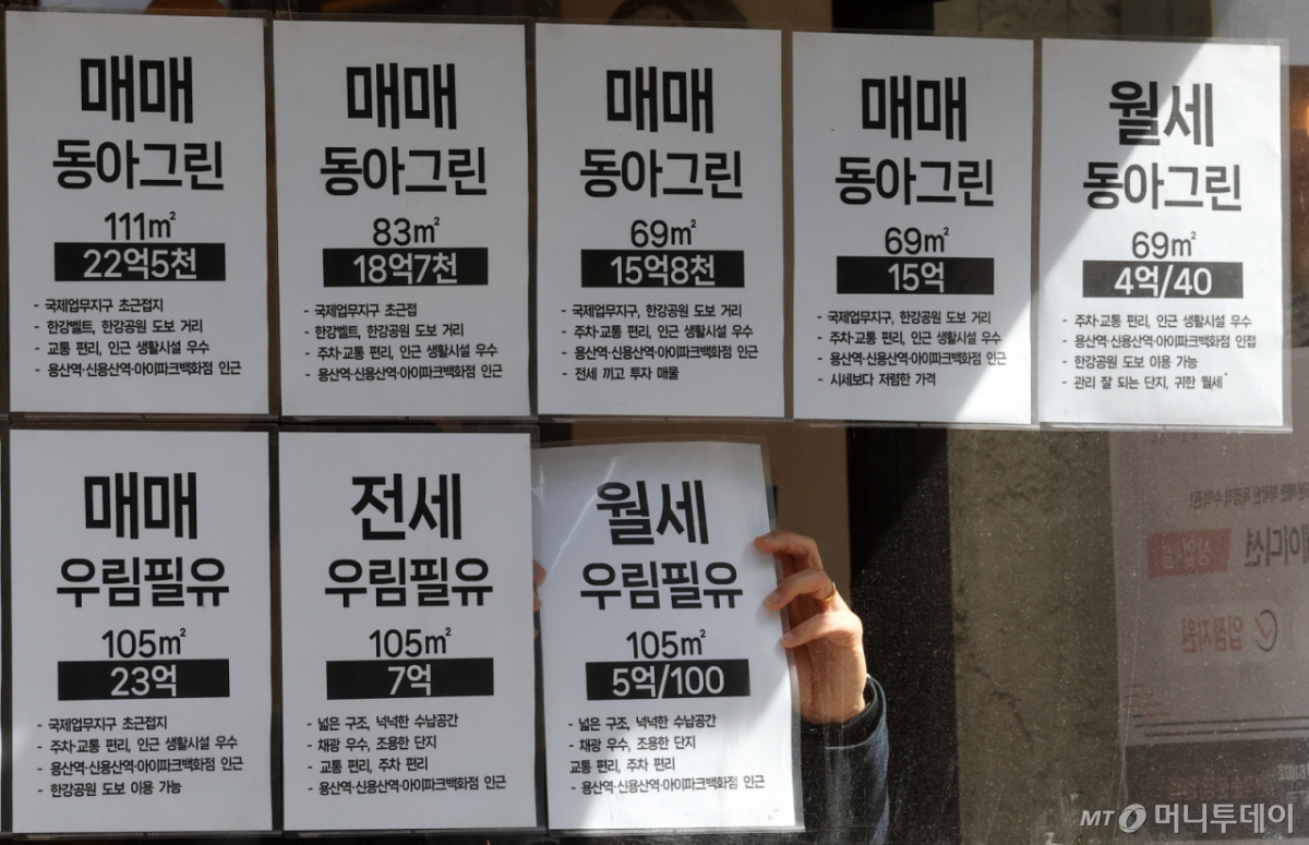 ![[서울=뉴시스] 최진석 기자 = 서울 아파트 전세가격 상승률이 약 6년 4개월 만에 최고치를 기록했다. 전국적으로도 전셋값 상승폭이 매매가의 2배를 넘어서며 전세시장 불안이 커지는 모습이다. 사진은 이날 오후 서울 한 부동산 게시판에 붙은 매매와 전세, 월세 등의 매물의 모습. 2026.04.23. myjs@newsis.com /사진=최진석](https://thumb.mt.co.kr/cdn-cgi/image/f=avif/21/2026/04/2026042316074450809_2.jpg)