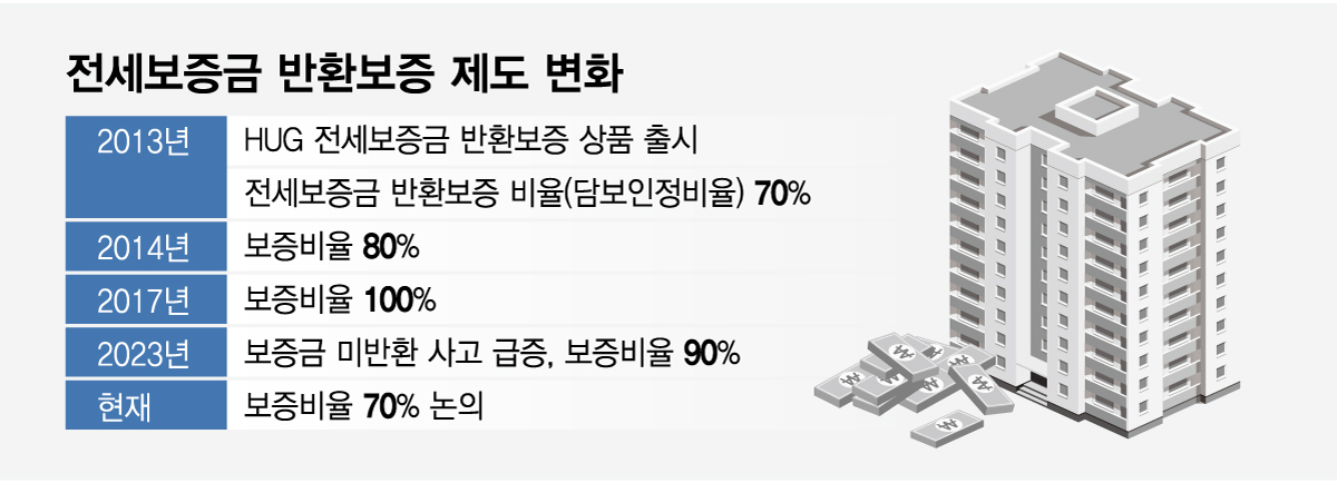 실제 HUG는 2013년 전세보증금 반환보증상품을 출시할 당시 70% 수준이던 반환보증비율을 2014년 80%, 2017년 100% 등 거듭 상향했다. 이후 전세금 미반환 사고가 급증하자 2023년 비율을 90%까지 낮췄지만 여전히 고위험 전세를 걸러내기에는 부족하다는 평가다.