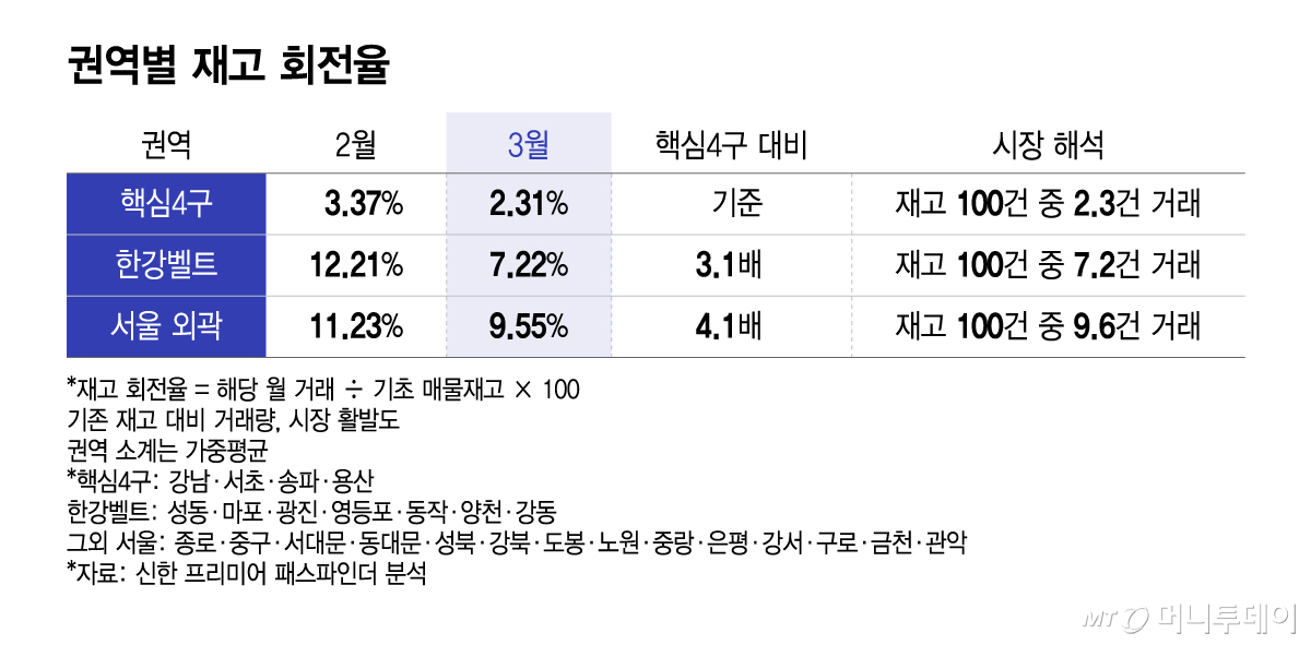 지표에서도 뚜렷하게 나타난다. 3월 기준 외곽지역 매물 흡수율은 107.1%로 신규 매물뿐 아니라 기존 재고까지 함께 소진되는 '소진 우위' 단계에 들어섰다. 같은 기간 핵심 4구는 16.6%에 그쳤고 재고 회전율도 외곽(9.55%)이 핵심 4구(2.31%)보다 4배 이상 높았다.