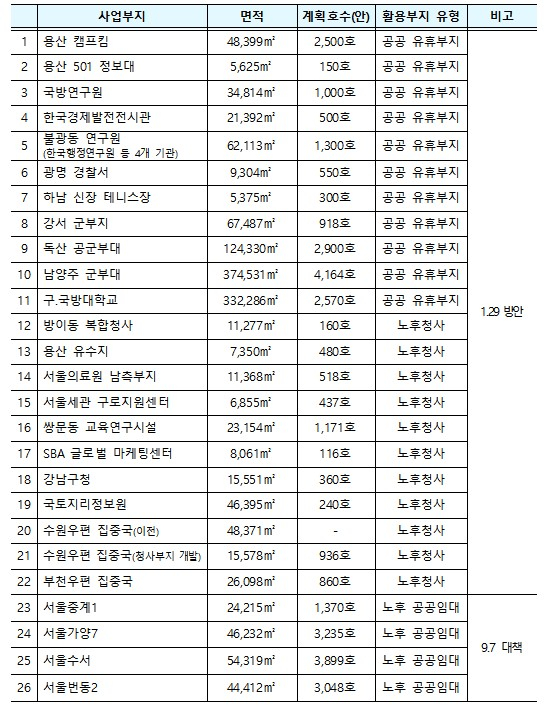 공급 물량은 총 3만4000가구 규모다. 이 중 1.29 방안 물량이 2만2000가구다. 정부는 이 가운데 약 2900가구를 2027년 착공할 계획이다. 이후 9.7 대책에 포함된 노후 공공임대 재건축 1만1600가구 등 총 3만4000가구를 2030년까지 순차적으로 착공해 나갈 계획이다.