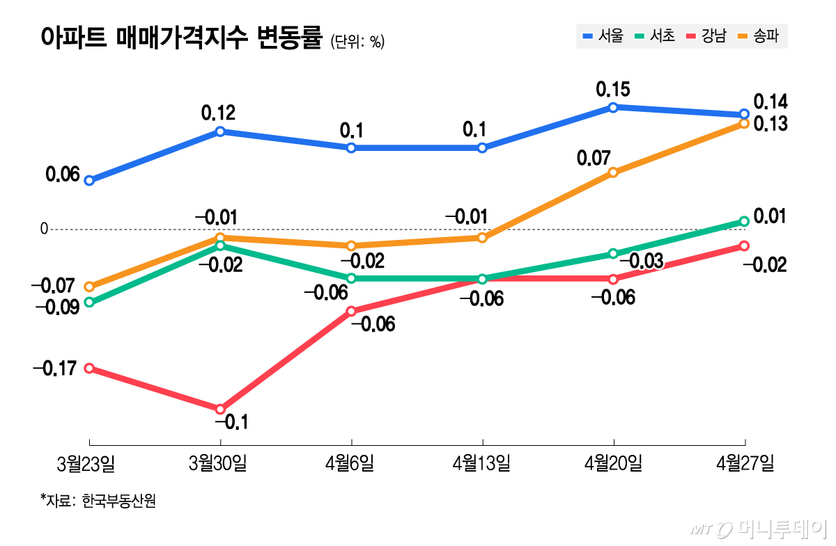 서울은 전주(0.15%)보다 상승 폭이 소폭 줄었지만 상승 흐름을 이어갔다. 지난 3월 말 이후 0.1%대 상승률을 유지하며 반등 국면을 이어가는 모습이다. 특히 강남권의 변화가 두드러졌다.