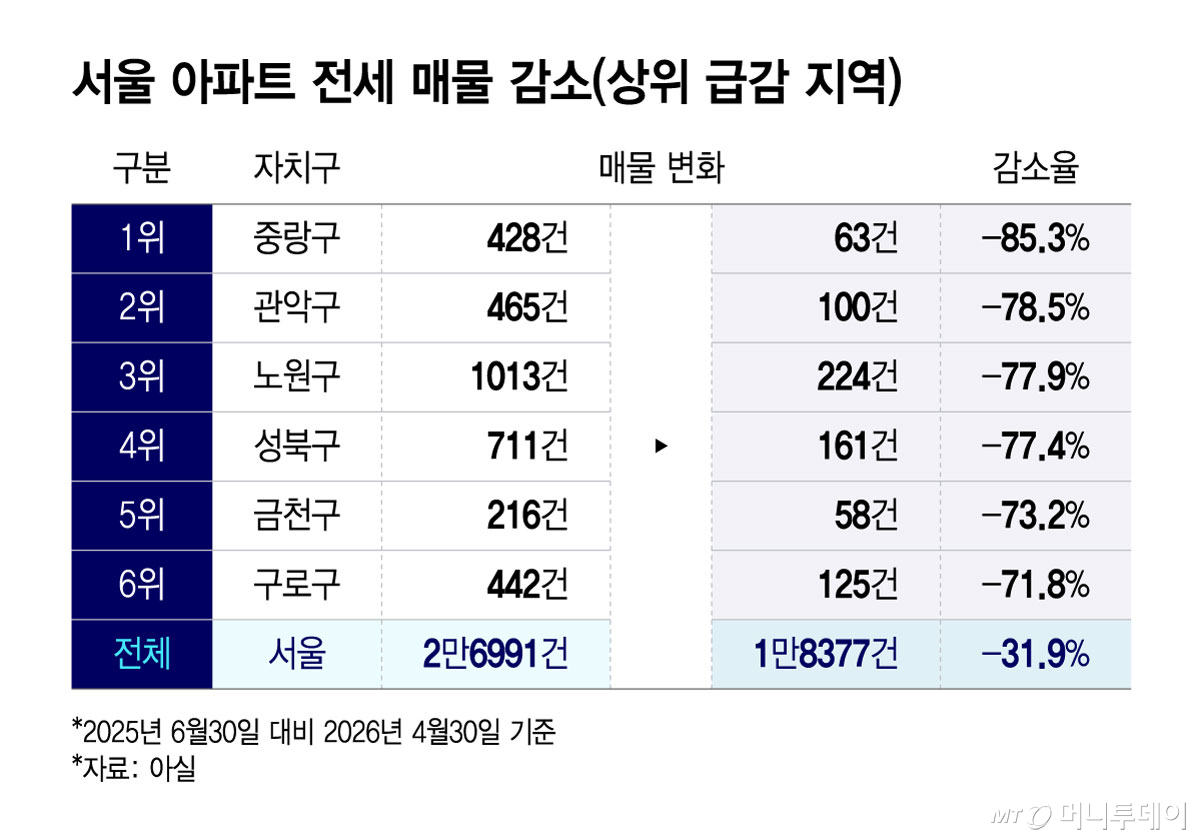 30일 부동산 빅데이터 플랫폼 아실에 따르면 이날 기준 서울 아파트 전세 매물은 1만8377건으로 집계됐다. 이는 지난해 6월30일 2만6991건과 비교해 8614건 감소한 것으로 감소율은 31.9%에 달한다. 전세 수요는 유지되는 반면 공급이 급감하며 수급 불균형이 빠르게 커지는 모습이다.