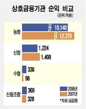 금감원은 이날 '2007년도 상호금융기관 경영실적' 자료를 통해 지난해 농협의 당기순이익이 1조2378억원으로 전년에 비해 2238억원 늘었다고 밝혔다. 신협(1408억원)은 물론 수협(98억원) 산림조합(328억원) 등과 비교하면 독보적인 규모다.