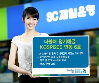 SC제일은행은 증시 성장률에 따라 지급이자를 결정하는 주가지수연동예금인 '더불어 정기예금 KOSPI200 연동 6호'를 오는 14일까지 한정 판매한다.