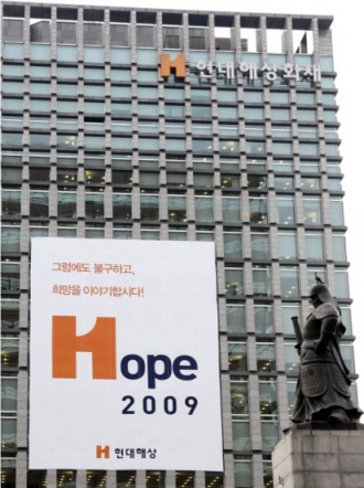 신년 메시지를 '희망'으로 정한 현대해상측은 "온 국민이 희망을 갖고 함께 어려운 경제위기를 극복하자는 의미로 광화문 본사 빌딩에 대형 현수막을 게시했다"고 밝혔다.