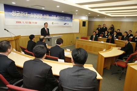 삼성생명은 지난해 9월 '맞춤형 금융전문가'를 육성을 목표로 성균관대와 계약학과 개설 협약을 맺었다. 삼성생명에서 선발된 영업 전문인력 20명은 이날 성균관대 보험금융 석사 과정에 1기로 합류하게 됐다.