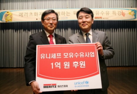 메리츠화재는 3일 유니세프와 공동으로 실시하는 모유수유 캠페인을 위해 후원금 1억원을 유니세프 한국위원회에 전달했다.