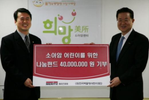 메리츠화재 원명수 부회장은 12일 한국백혈병어린이재단에 나눔펀드 모금액 4000만원을 전달했다. 이번 성금은 2008년 시작된 소아암 어린이 후원 사업의 일환으로 소아암 어린이들의 치료와 소아암 어린이 캠프 및 체험활동 등에 지원될 예정이다.