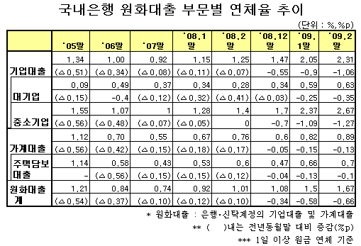 2005년말 1.21%에 달했던 원화대출 연체율은 2008년 1월말 0.92%까지 떨어졌으나 이후 완만한 상승세가 지속되며 작년말 1.08%로 높아졌다. 하지만 금융위기가 실물경기로 전이되면서 올해 1월말 1.50%로 뛰었고, 2월말에는 1.67%를 기록했다.